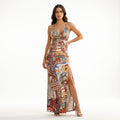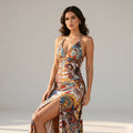 This dress embodies effortless luxury with a refined, resort-ready elegance. Crafted on a rich base with intricate, art-inspired motifs, it delivers a timeless and opulent aesthetic. The halter neckline softly frames the décolletage, while the sculpted bodice enhances the silhouette with a flattering, contoured fit. Flowing into a graceful floor-length skirt with a subtle front slit, the design allows fluid movement with understated allure. Perfectly balanced between sophistication and sensuality, this piece is ideal for sunset soirées, luxury escapes, and elegant evening occasions.